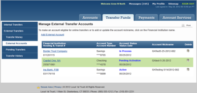 Updating an External Account – Allows you to update the account nickname for any external account listed on the Manage External Transfer Accounts page with an Account Status of “In Process” or “Active.”